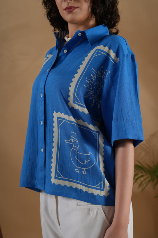 Boxy Fit- Flower Embroidered Shirt Blue