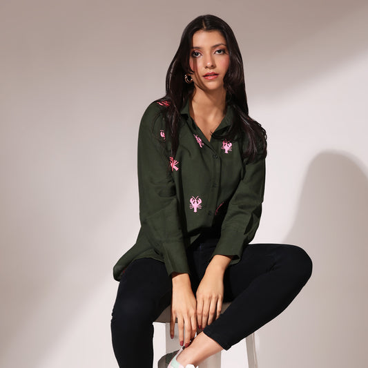 Oversized Embroidered Shirt- Lobster Olive