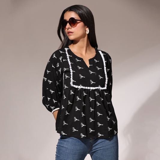 Embroidered Top- Birds of Paradise Black