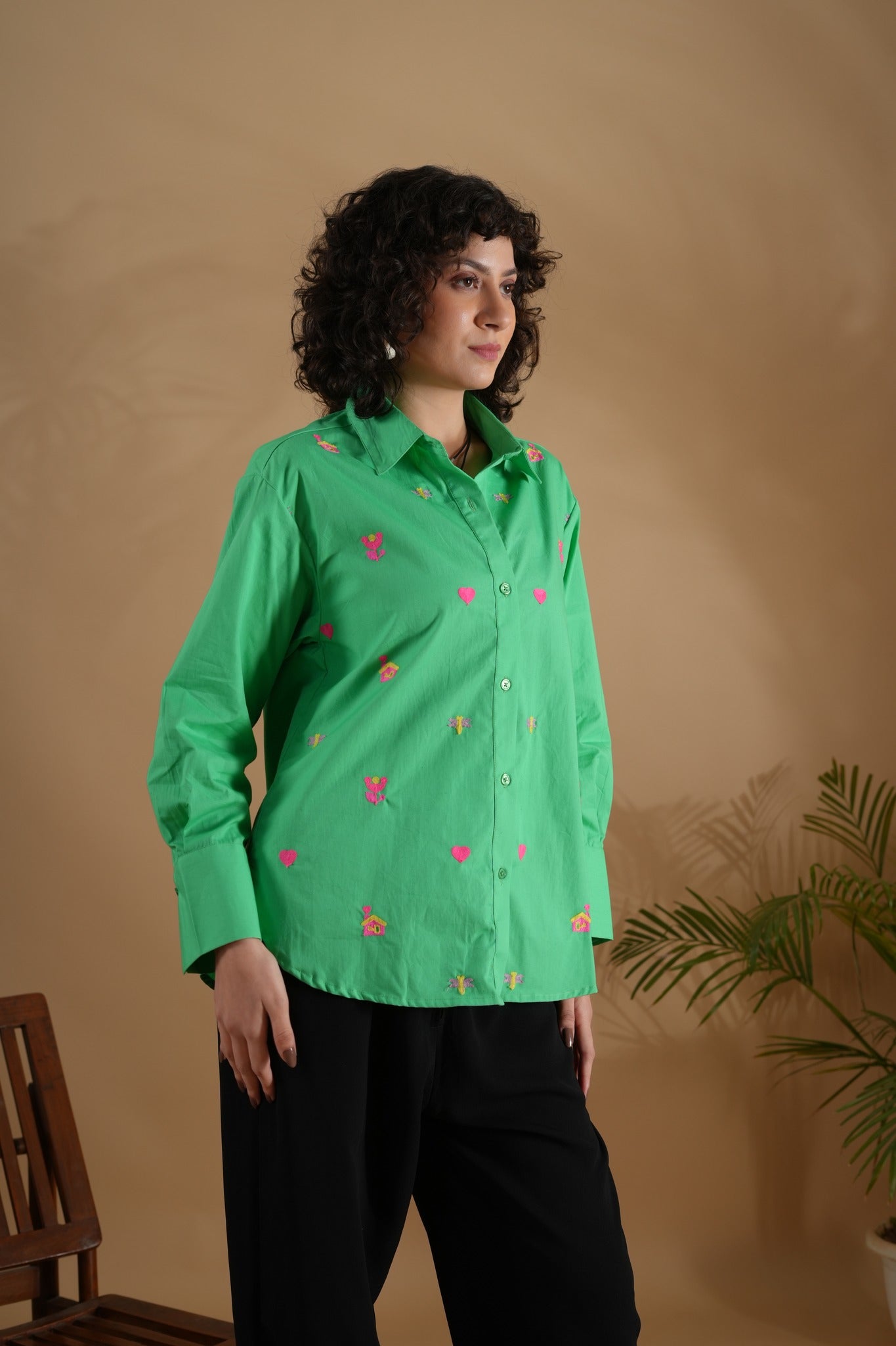 Introducing our Oversized Embroidered Shirt - a playful nod to our childhood nostalgia. Made with pure cotton and soft handfeel, this shirt is adorned with colourful thread embroidery, inspired by childhood drawings. Relive those carefree days with our hearts and houses design. Keep the childlike spirit alive.